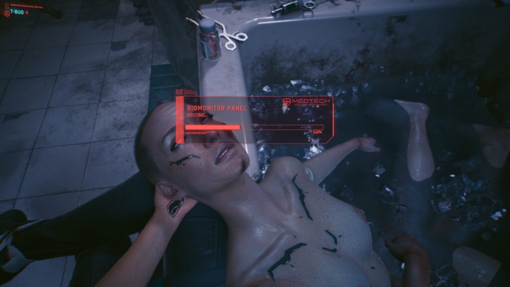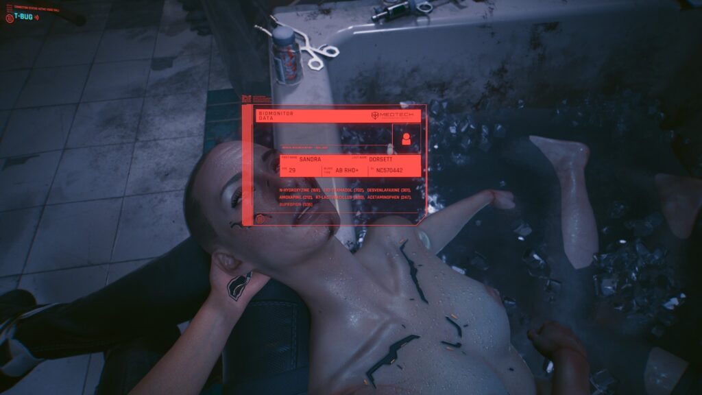 A heads up display integrated directly into the persons eyesight as a form of augmented reality, showing the biomonitoring details of the person in front of them